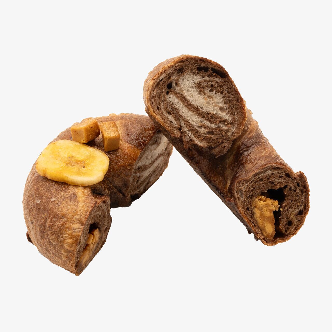 ココアとプレーンのマーブル生地にキャラメルチョコチップとセミドライバナナを包みました!!
